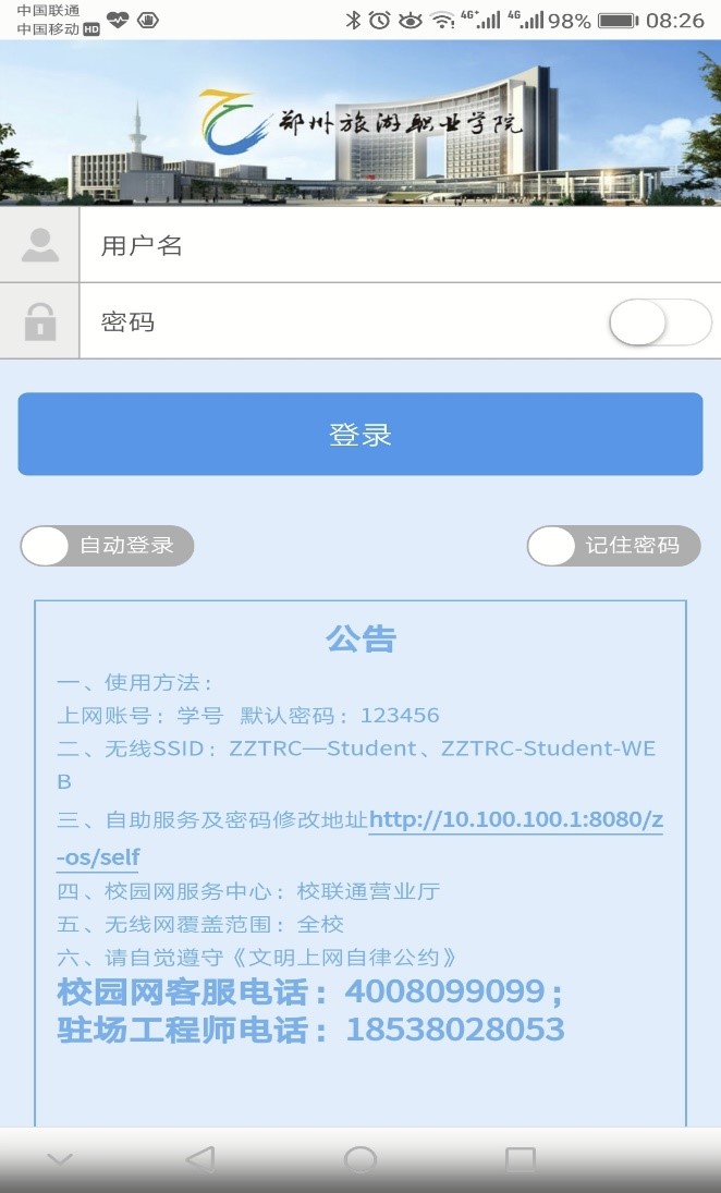 在无线网卡获取的ID中选取ZZTRC-Teacher-WEB(学生选ZZTRC-Student-WEB),点连接,成功后打开手机浏览器,即出现图一所示登录界面,输入个人账号及密码即可上网,或者在获取的无线ID中选取ZZTRC-Teacher(学生选ZZTRC-Student),即可打开如图三所示界面,在身份栏中填入个人账号,在密码栏中填入密码,点击连接,即可上网。