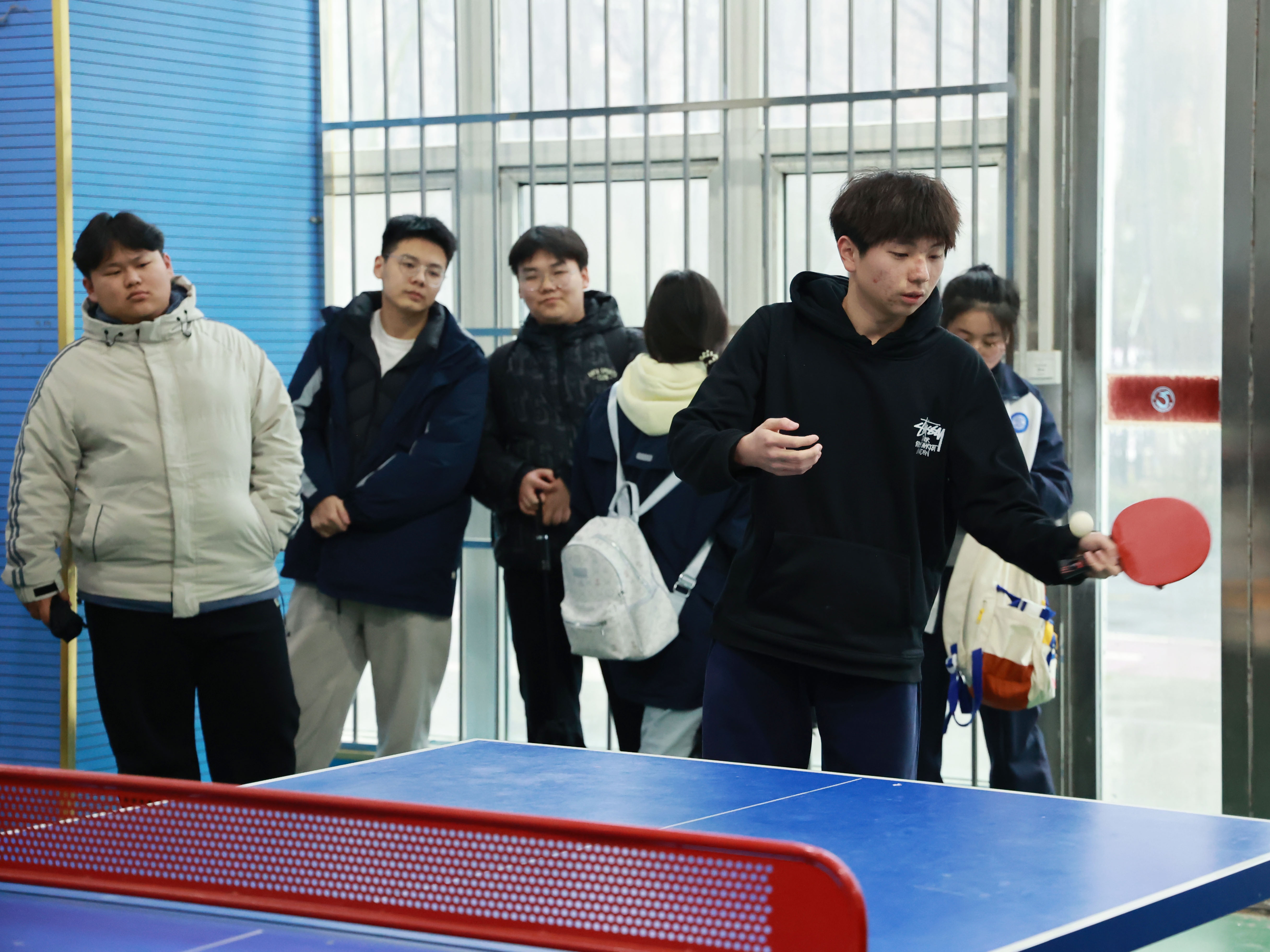 比赛现场气氛热烈,每一场比赛都扣人心弦。尤其是班主任们的对决更是引起围观学生的阵阵喝彩,把比赛的气氛推向高潮。发球、旋转、扣杀、防守……无论是老师还是学生都是全神贯注、沉着应战,小小的白色乒乓球在球桌上来回穿梭,划出一道道灵动的弧线。直拍横打、反手削球、大力扣杀等精彩招式轮番上演,精湛的球技引得现场观众的掌声。选手们不畏强手、敢打敢拼,即便比分落后也绝不轻言放弃,每一次救球、每一分争夺都尽显拼搏精神。