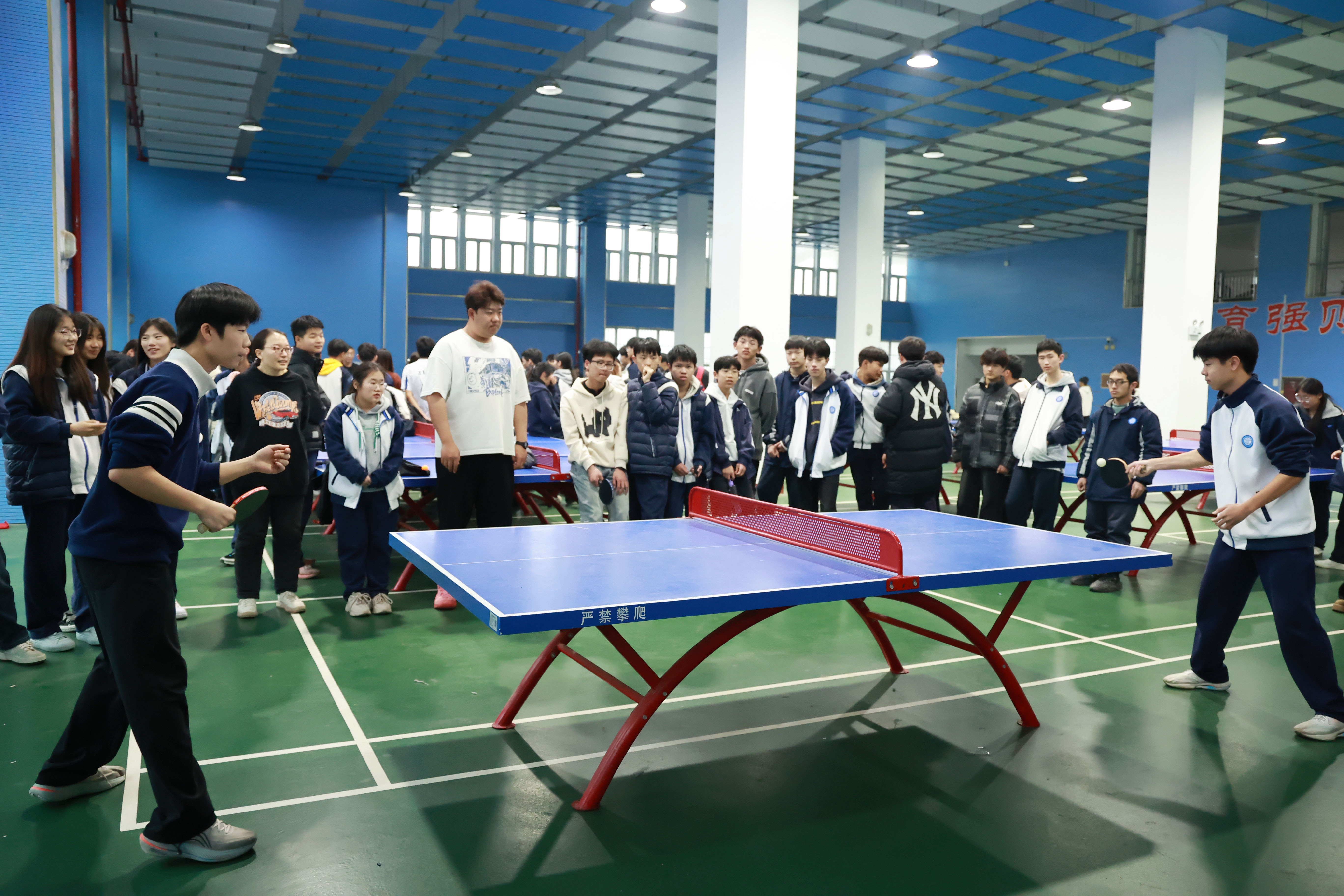 比赛现场气氛热烈,每一场比赛都扣人心弦。尤其是班主任们的对决更是引起围观学生的阵阵喝彩,把比赛的气氛推向高潮。发球、旋转、扣杀、防守……无论是老师还是学生都是全神贯注、沉着应战,小小的白色乒乓球在球桌上来回穿梭,划出一道道灵动的弧线。直拍横打、反手削球、大力扣杀等精彩招式轮番上演,精湛的球技引得现场观众的掌声。选手们不畏强手、敢打敢拼,即便比分落后也绝不轻言放弃,每一次救球、每一分争夺都尽显拼搏精神。