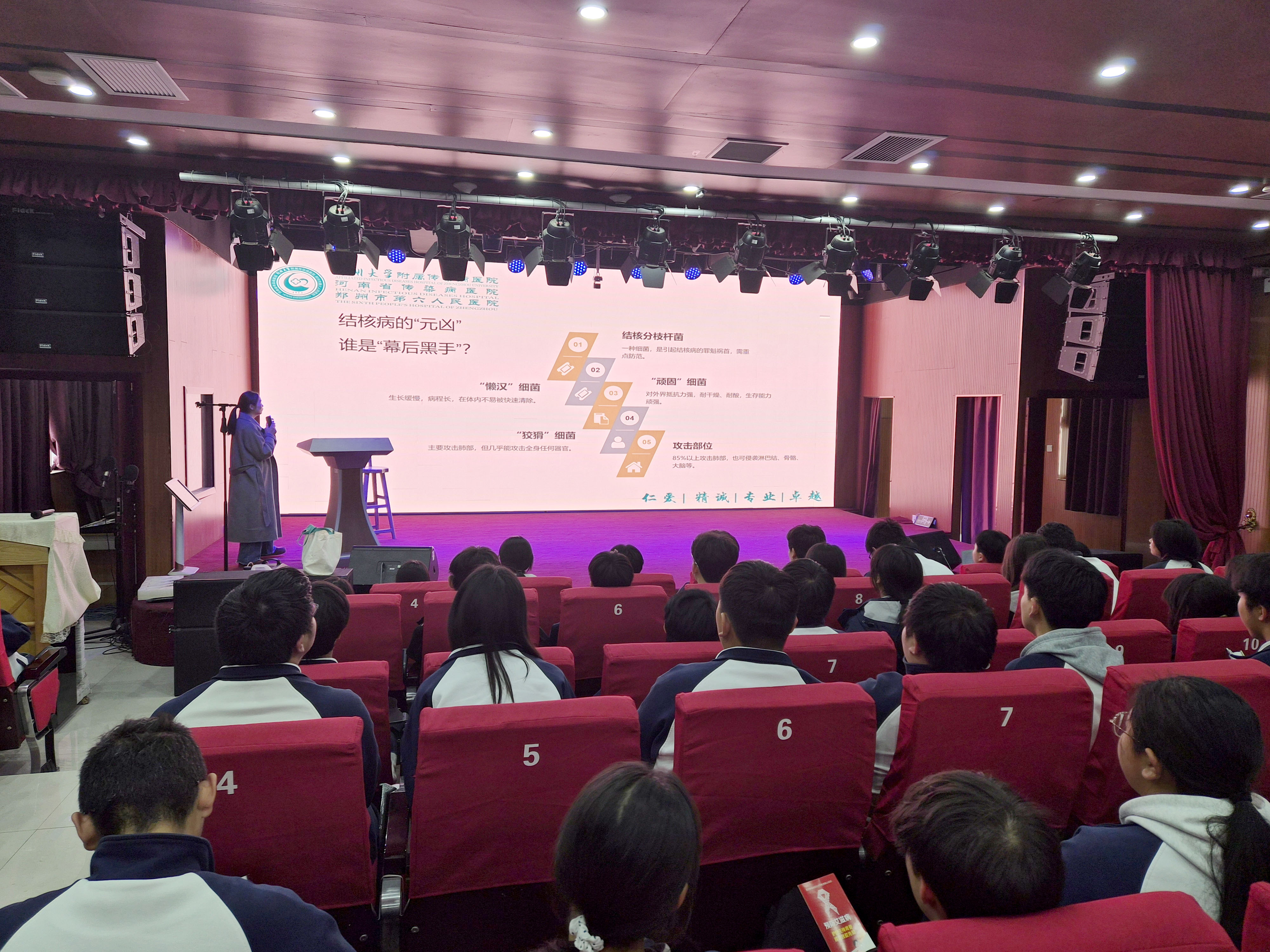 为切实加强校园传染病防控,提升师生结核病防治意识与防护能力,在教育局保健站的统筹安排下,3月26日下午,郑州市第六人民医院结核科专家受邀来到郑州市信息技术学校报告厅,开展结核病防治健康专题讲座,各班级选派学生代表到场参与学习。